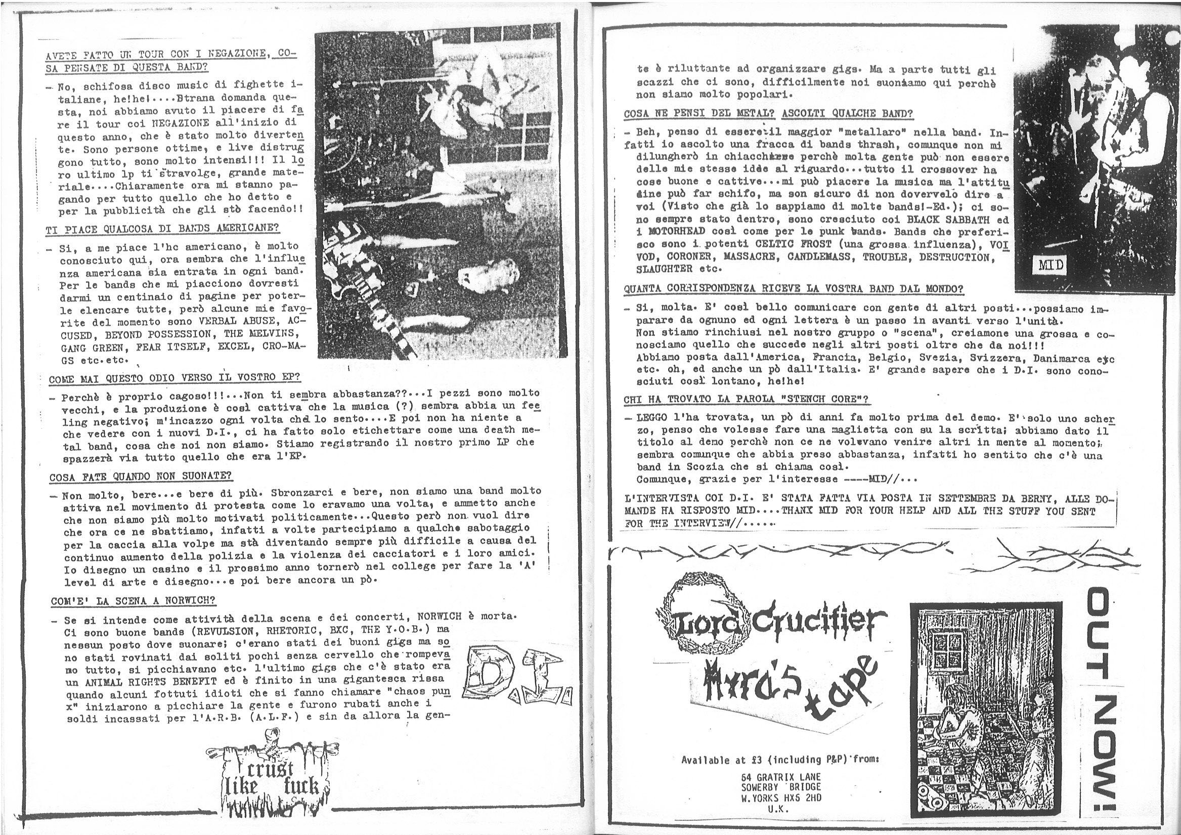 Gang Green, Cro-Mags, Murphys Law, Upset Noise, Bad Brains, Accused, Motörhead, Slaughter, V/A-Will Evil Win, Sodom, Creepin Death, Heretic, King Diamond, Heresy, Concrete Sox, Napalm Death, Thanatos, Mayhem (NOR), Necrophagia LA, Wehrmacht, Beastie Boys, Run DMC, Darkness, Chaos UK, Extreme Noise Terror, DYS, V/A-Thrasher-Skate Rock Vol 3, Slapshot, No Mercy, Savage Steel, Incinerator, Holy Terror, Hellbastard, Cryptic Slaughter, Verbal Abuse, Blast Furnace, Casbah, Corrosion Of Conformity, Dr Know, Kazjurol, Government Issue, Pentagram, Egg Hunt, No Fraud, Lord Crucifier, Excruciation.