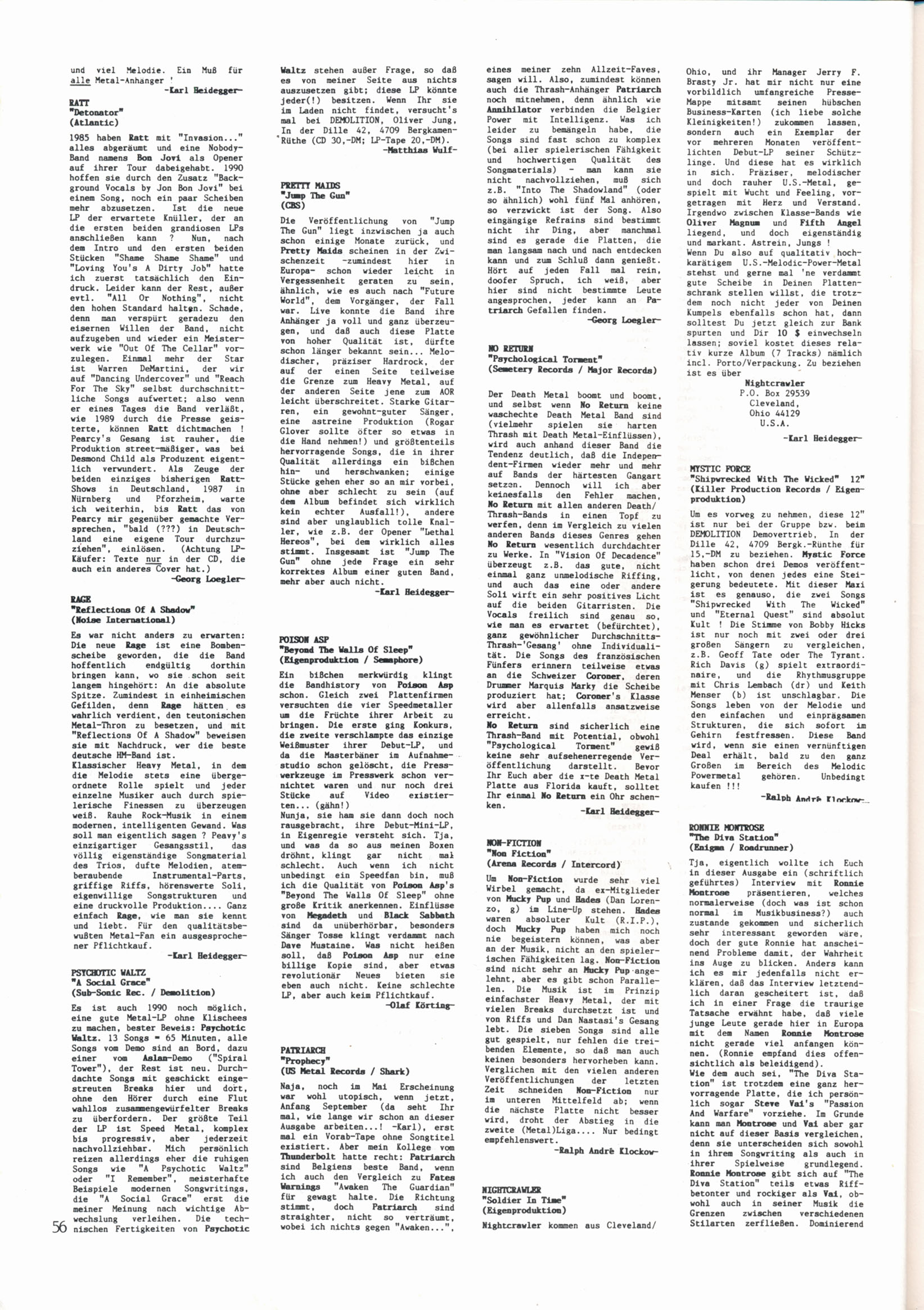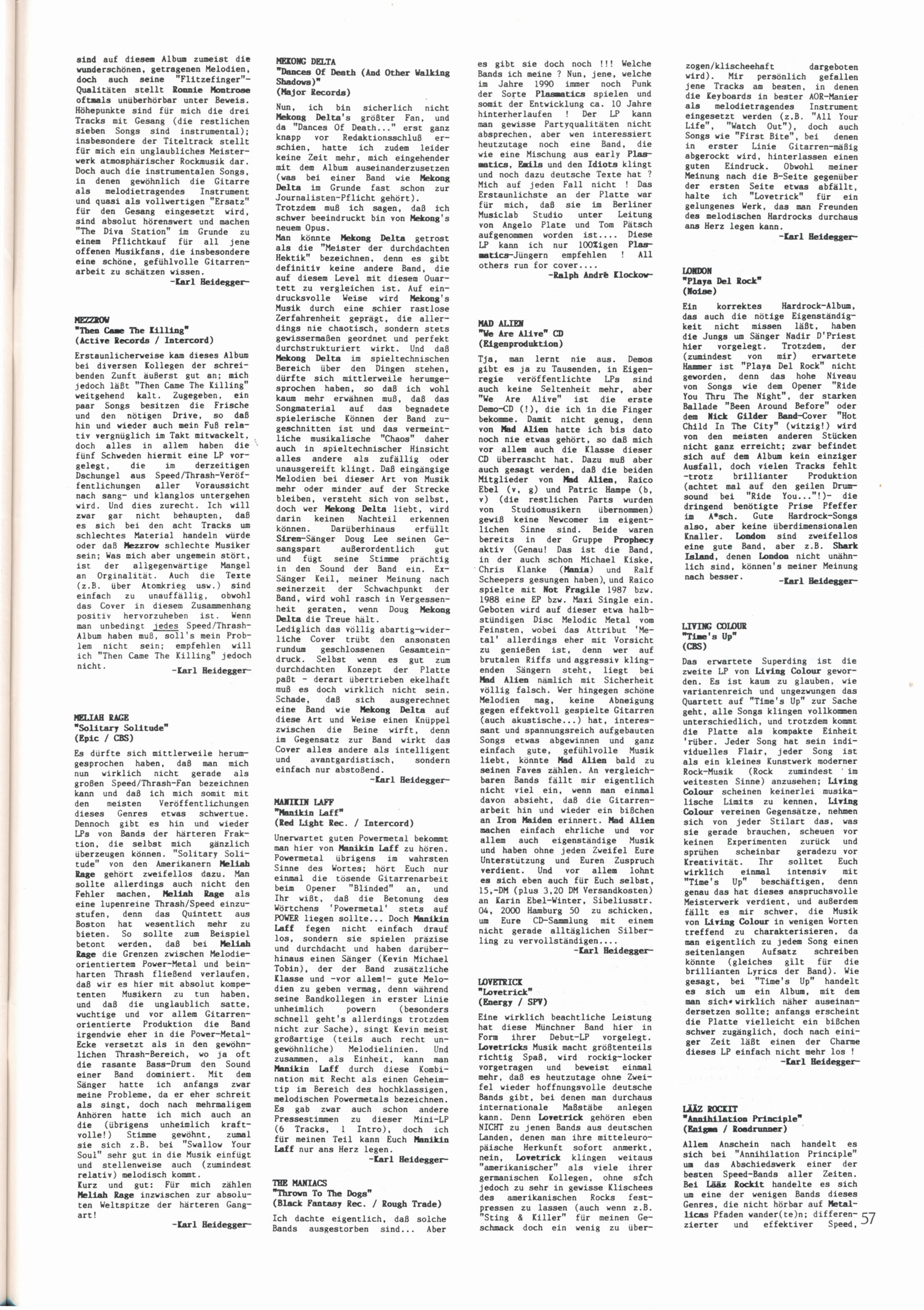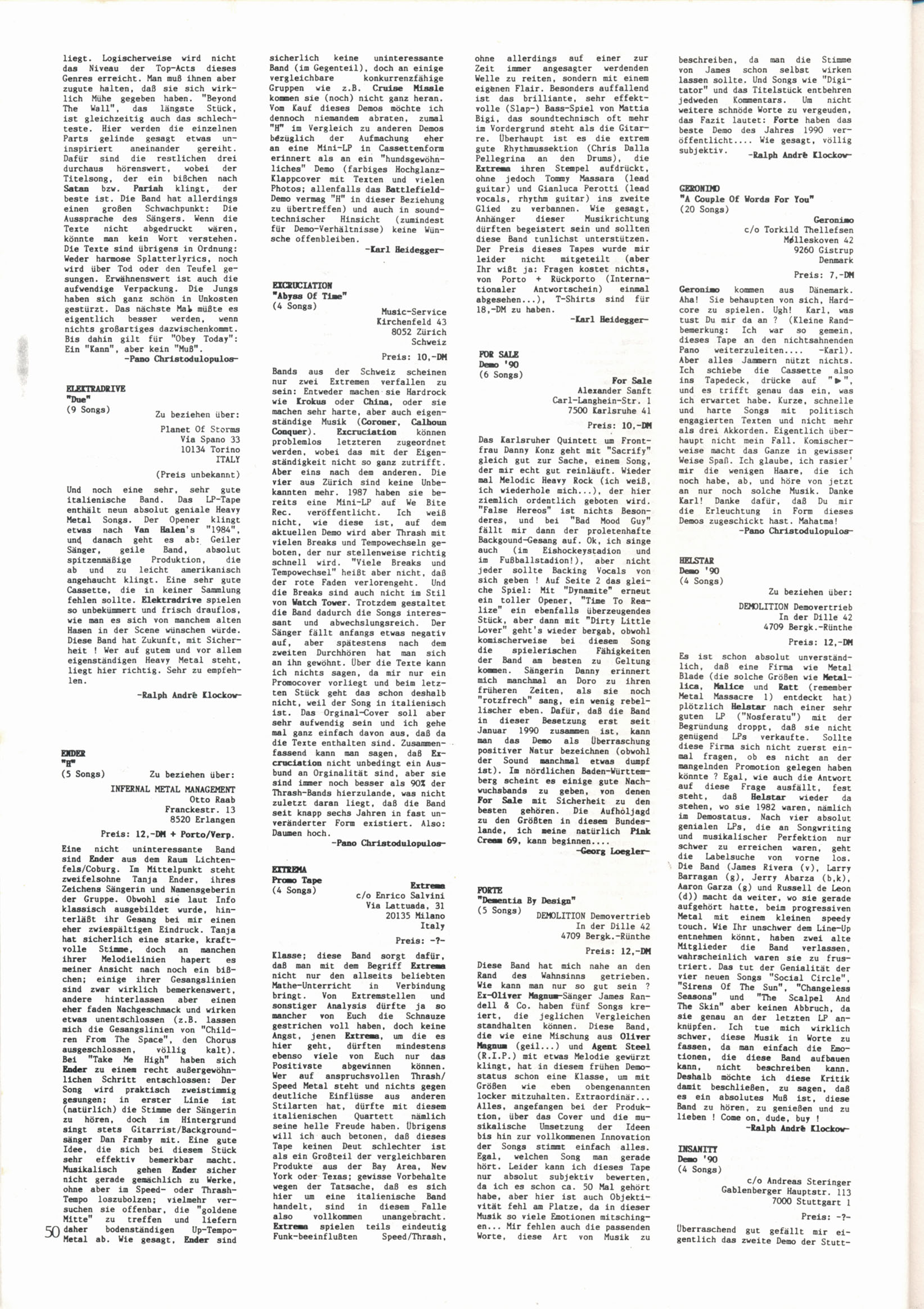 Aftermath (USA-IL), Angantyr, Anguish, Apostasy, Appomattox, Battlefield, Bethlehem, Bronxx, Central Power Unit, Chainsaw Killers, Chemikill, Cruise Missile, Daydream (GER), Deceiver, Deterrent, Elektradrive, Ender, Excruciation, Extrema, For Sale, Forte, Geronimo, Helstar, Insanity (GER), Last Rites, Laughing Head, Lunatic Terror, Medusa (GER), Medusha, Messiah (USA-NC), Napalm Terror, Osiris, Radar (USA-NY), Ragna Rök, Rain'N Steel, Rigid Domain, Rough Silk, Seven Wishes, Surgeon, TBC What, Titan Force, Toxic Trace, Twilight Zone (GER), Wench, Wicked Angel, System Decay, The Unapproachable Slawheads, Rattlehead, Warrant, Vixen, Violence, Steve Vai, V2, Tsunami, TSOL, Trouble Tribe, Torture, Thyron, Tender Fury, Sweet FA, STS 8 Mission, Stitch, Dave Sharman, Shanghai'd Guts, Saxon, Sardonyx, Saint Vania, Andrew Ridgeley, Realm, Raven, Ratt, Rage, Psychotic Waltz, Pretty Maids, Poison Asp, Patriarch, No Return, Non-Fiction, Nightcrawler (USA-OH), Mystic Force, Ronnie Montrose, Mezzrow, Meliah Rage, Mekong Delta, Manikin Laff, The Maniacs, Mad Alien, Lovetrick, London, Living Color, Lääz Rockit, The Krixhjälters, Kreator, King's X, Jezebelle, Hexenhaus, Heads Up, Handsome Beasts, Ghandi, Elixir, Drive She Said, Dorsal Atlantica, Depp Jones, Death Angel, Dark Angel, Alice Cooper, Chastain, CIA, Celtic Frost, Burning Tree, Boysvoice, Bitter End, Bathory, Barren Cross, Bad Religion, Axxis, Attakk, The Atom Seed, Annihilator, Animosity, Angkor Wat, Alice In Chains, Agressor, ADX, 24-7 Spyz, AOK, Johnny Crash, V/A-Metal Massacre 10, V/A-Heavy Metal Heroes vol III, V/A-Doomsday News III, Attitude, The Bombshells, Crucifiction, Doomsday, Helicon, The Hullabaloo, Scarecrow, Wasted Morality.
