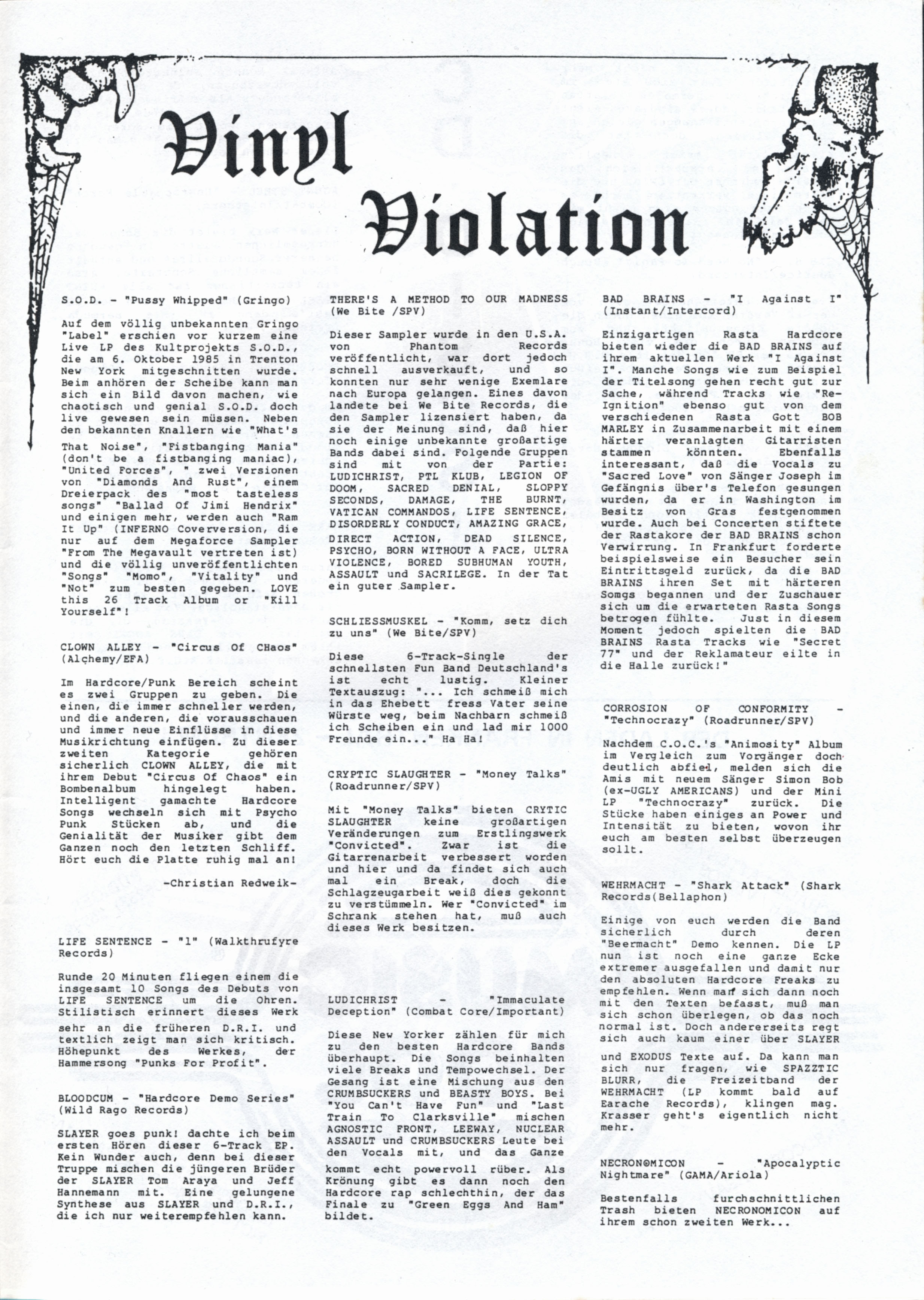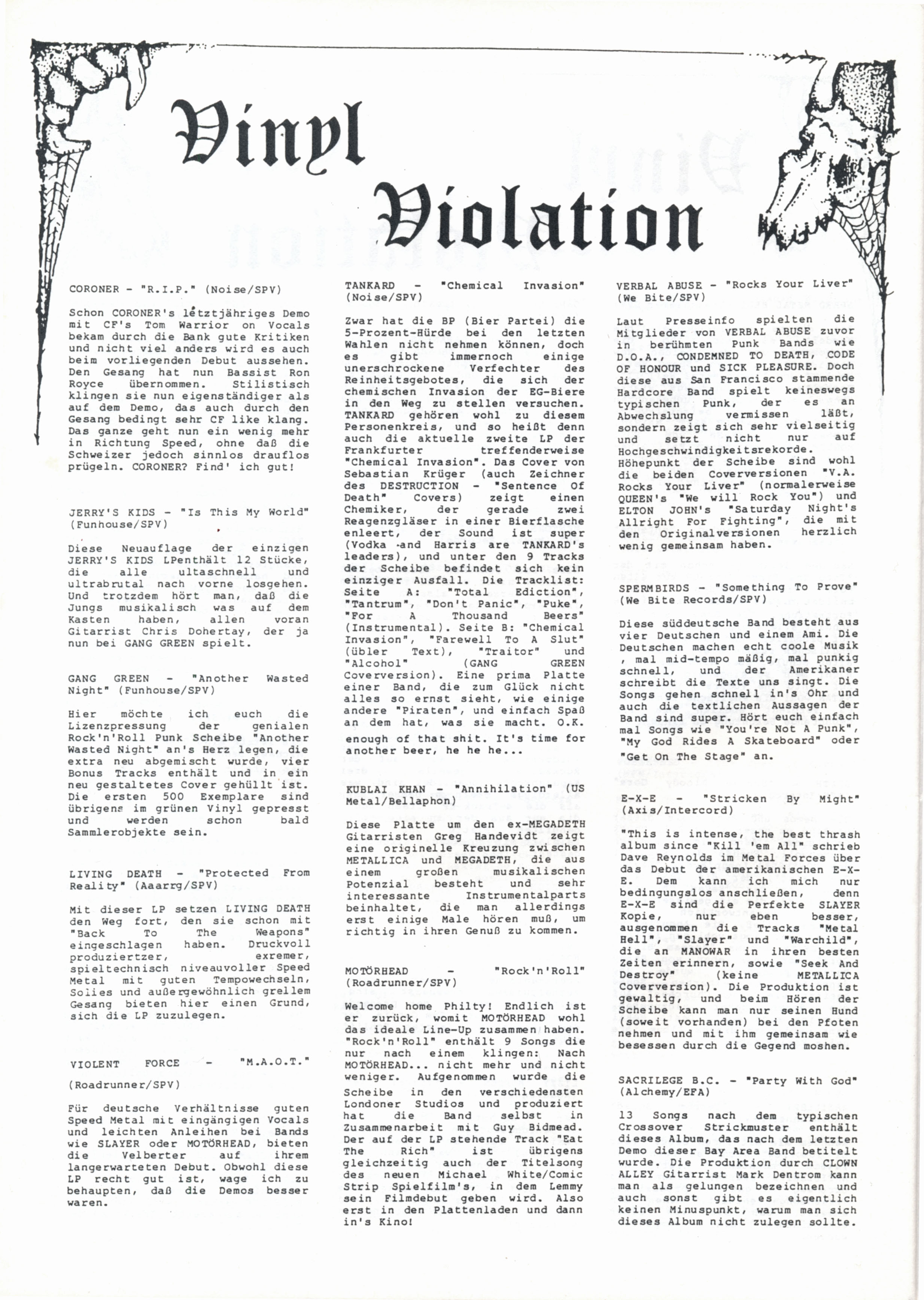 V/A-US Speedcore Invasion, Destruction, Bathory, Celtic Frost, Holy Terror, Anvil, Hades, The Cult, Holy Moses, Nuclear Assault, Possessed, Excruciation, GBH, V/A-Speed Metal Hell 1+2, Satan, Death, Artillery, Darkness, Mentors, Tension, Lizzy Borden, Blood Feast, Rage, King Diamond, Exploited, Pentagram (CHI), Coroner, Jerry's Kids, Gang Green, Living Death, Violent Force, Tankard, Kublai Khan, Motörhead, Verbal Abuse, Spermbirds, E-X-E, Sacrilege BC, SOD, Clown Alley, Life Sentence, Bloodcum, V/A-There's A Method To Our Madness, Schleissmuskel, Cryptic Slaughter, Ludichrist, Bad Brains, Corrosion Of Conformity, Wehrmacht, Necronomicon, Anthrax, Agent Steel, Exodus, Dark Angel.
