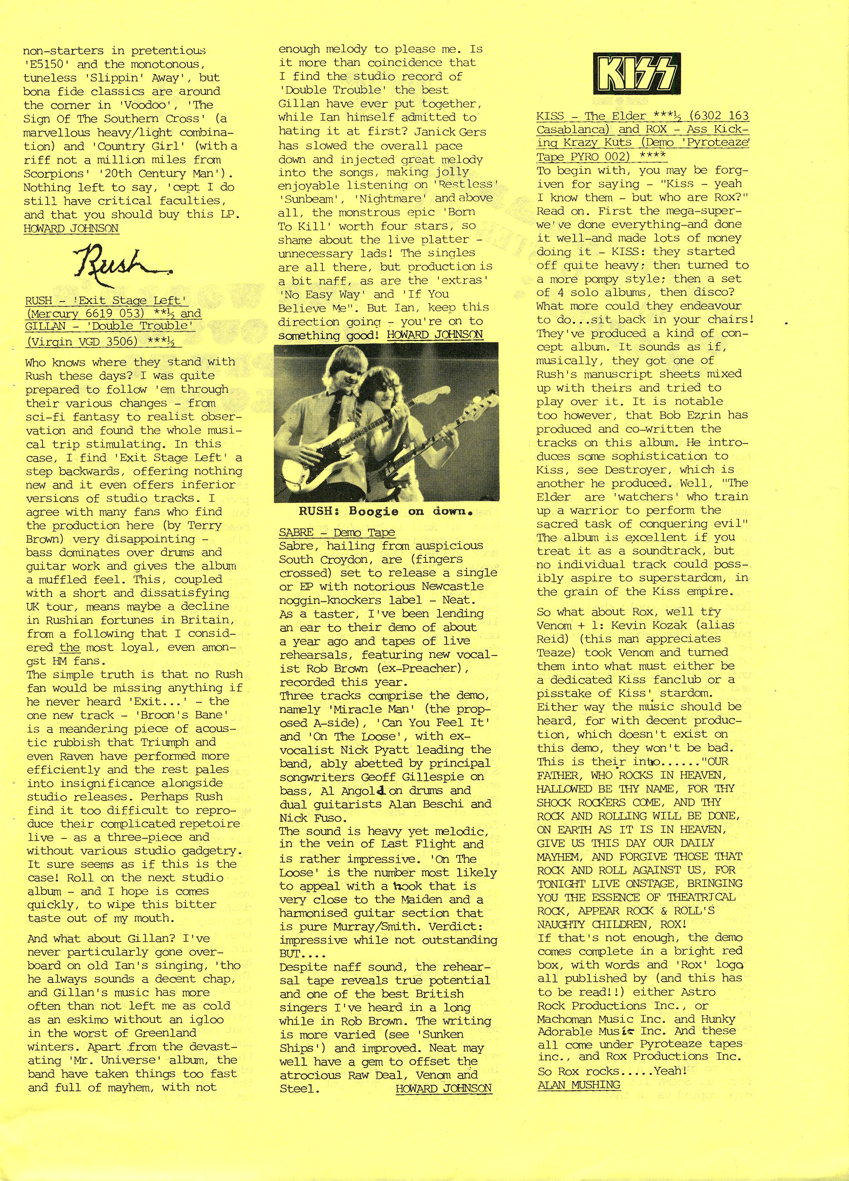 Raven, Tygers Of Pan Tang, Saxon, Deadly Embrace, Iron Maiden, AC/DC, Little River Band, V/A-Heavy Metal soundtrack, Black Sabbath, Rush, Sabre (UK), Kiss, Kix, Rainbow, MSG, Rolling Stones, Pink Floyd, Queen, Riot, Y&T, The Rods, Snow, Journey, V/A-US Metal, Bob Seger, 38 Special, ZZ Top, The Tubes.