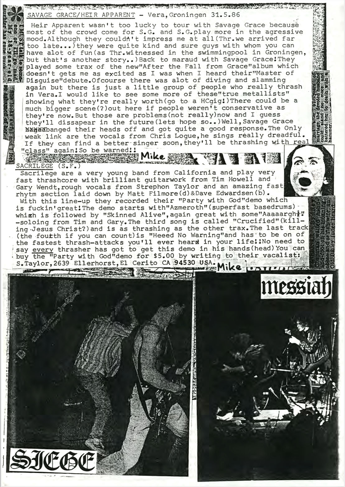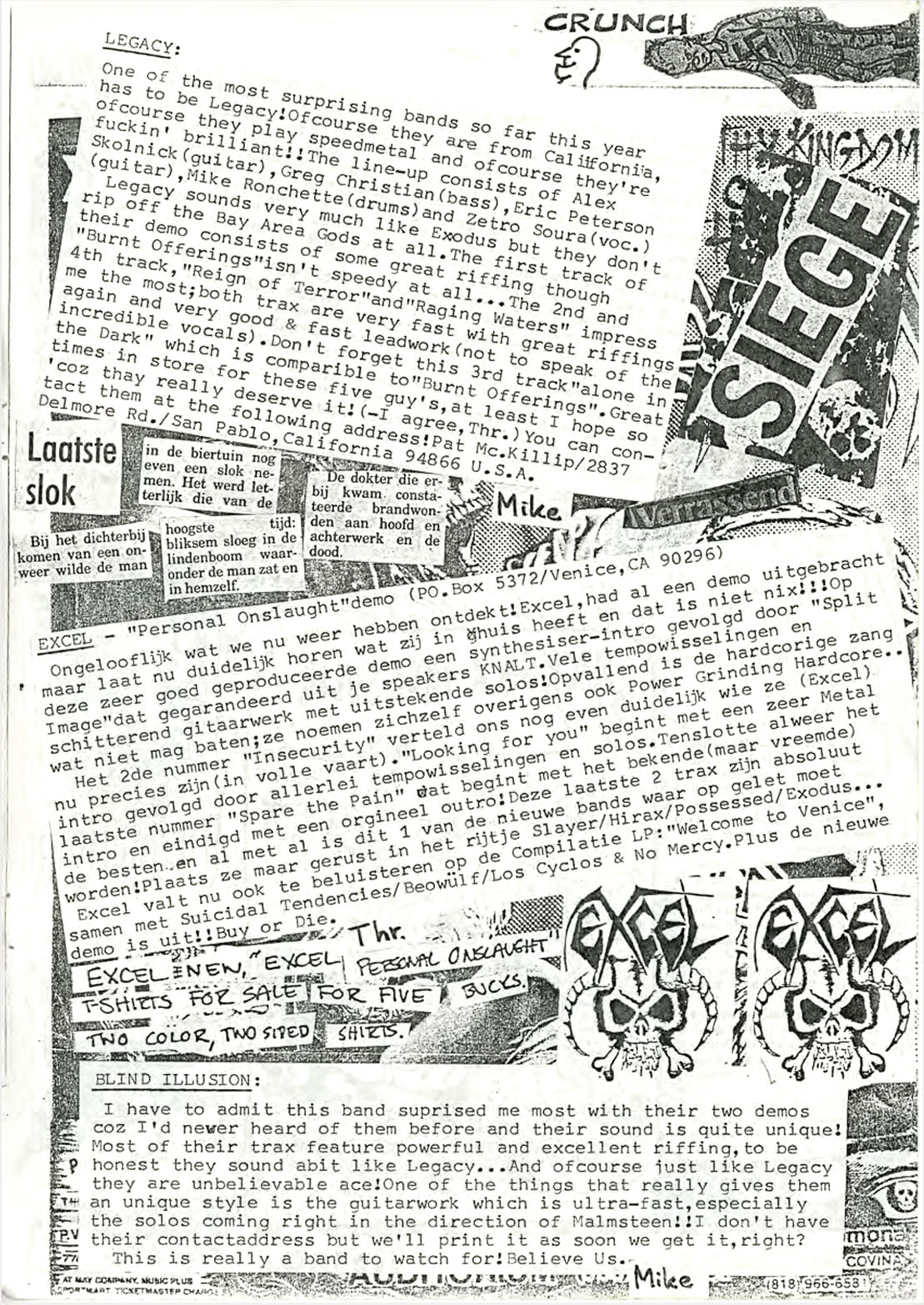 Pandemonium (HOL), Messiah, Kreator, DRI, English Dogs, Whiplash, Beyond Possession, Negazione, PMS, Legacy (USA-CA), Excel, Blind Illusion, Sacrilege BC, Skullcrusher.