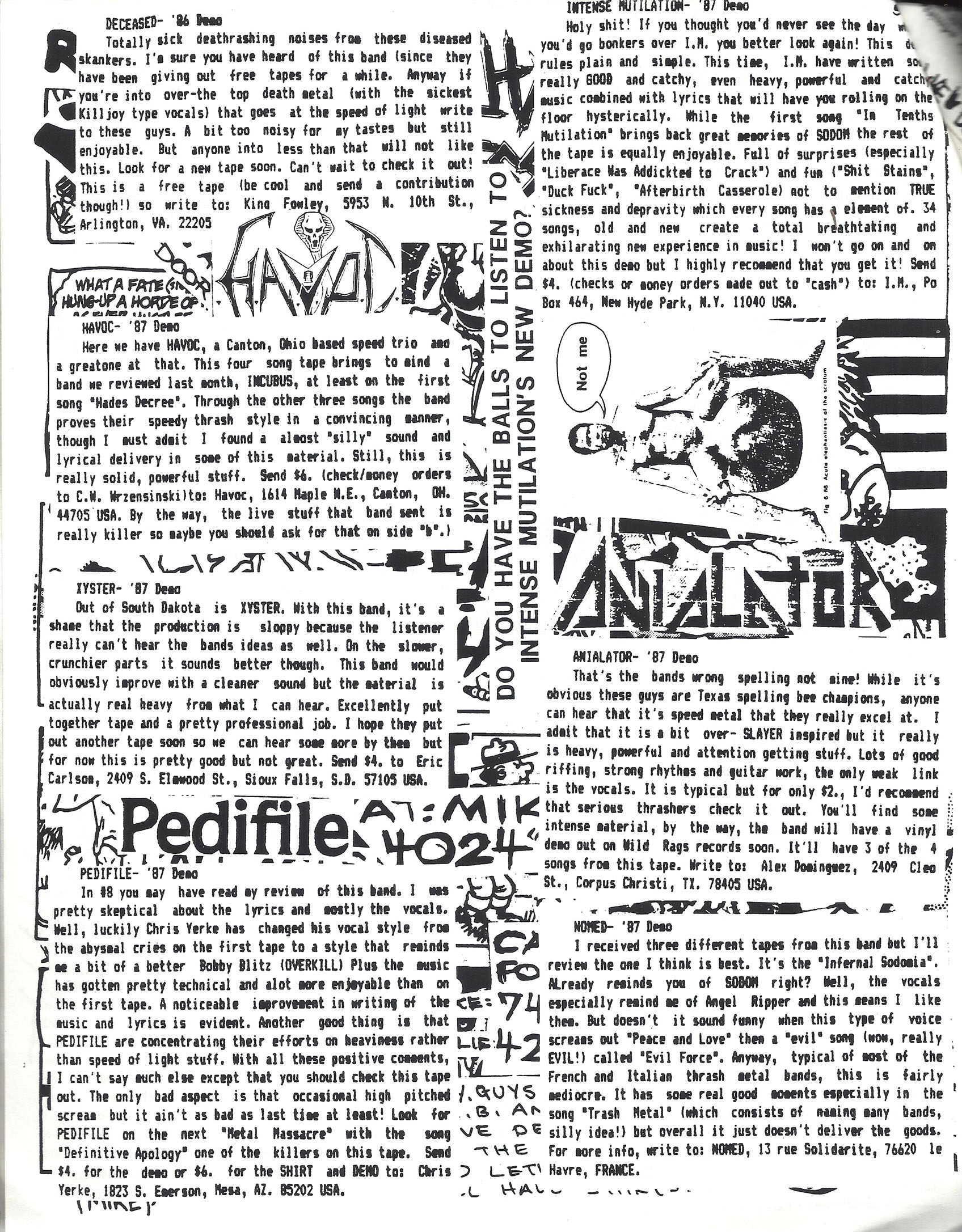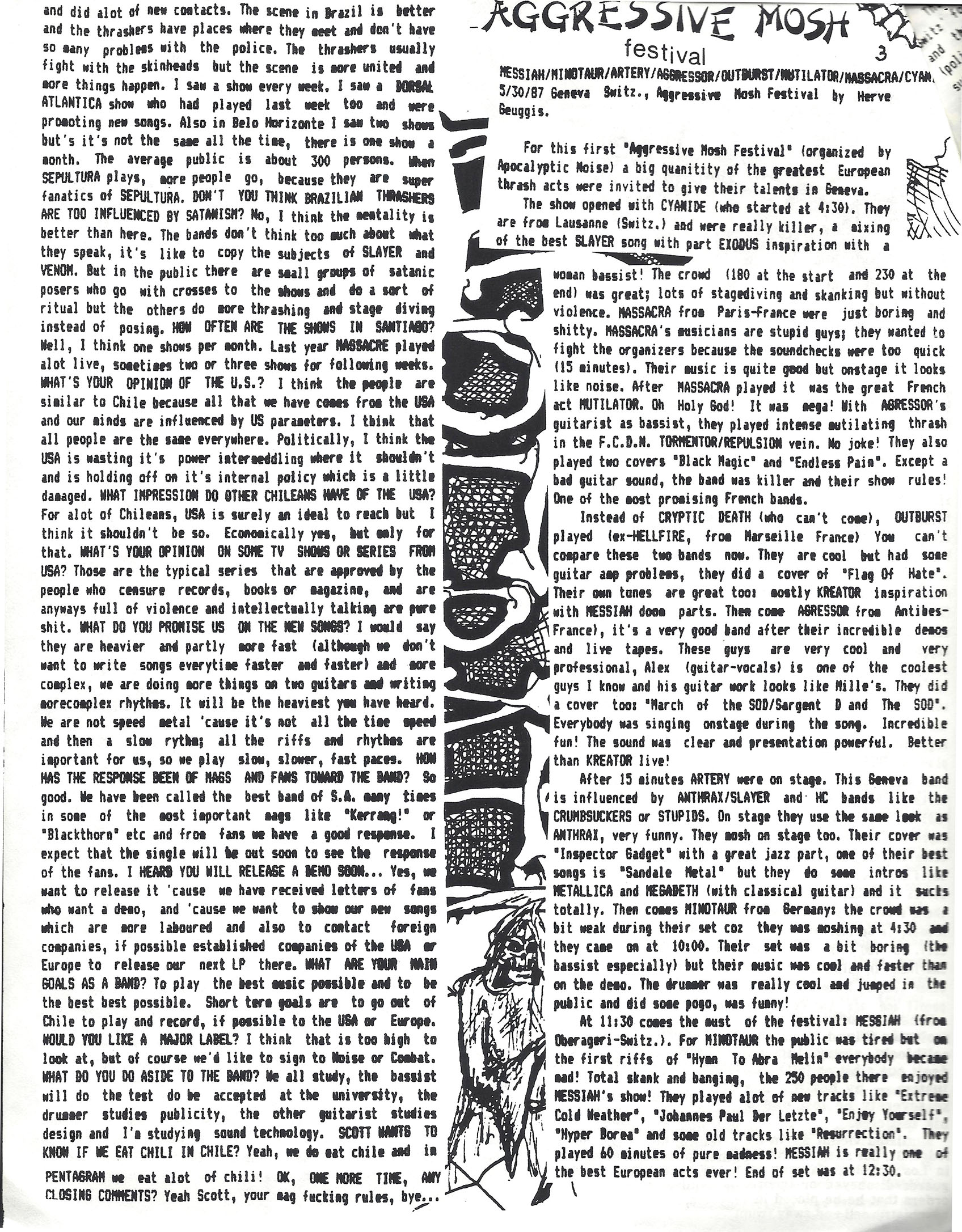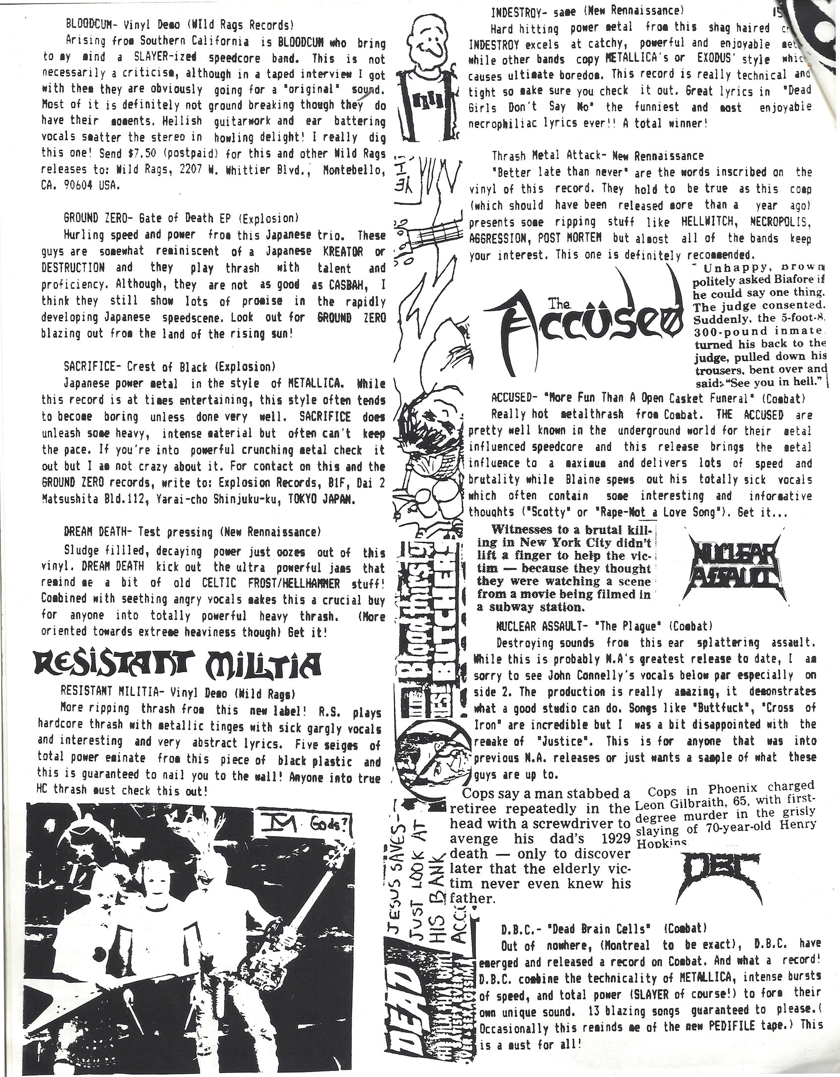 News, live reviews (Cyanide (SWI), Massacra, Mutilator (FRA), Outburst (FRA), Agressor, Artery, Minotaur, Messiah (SWI)), article on PMRC, Irish scene report (Killerwatt, Panic (IRE))..