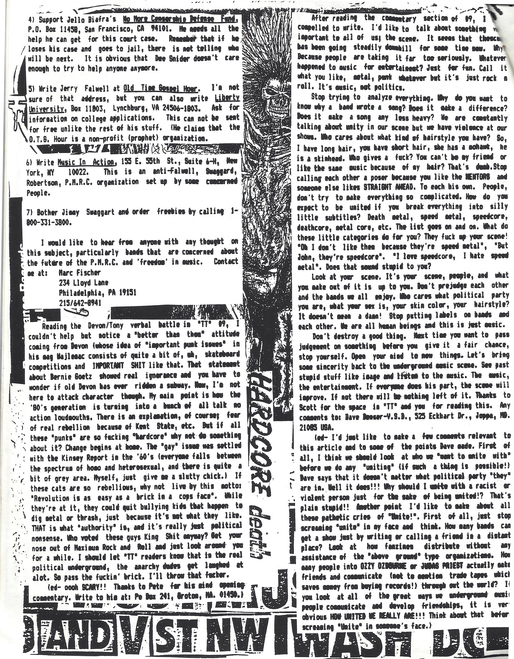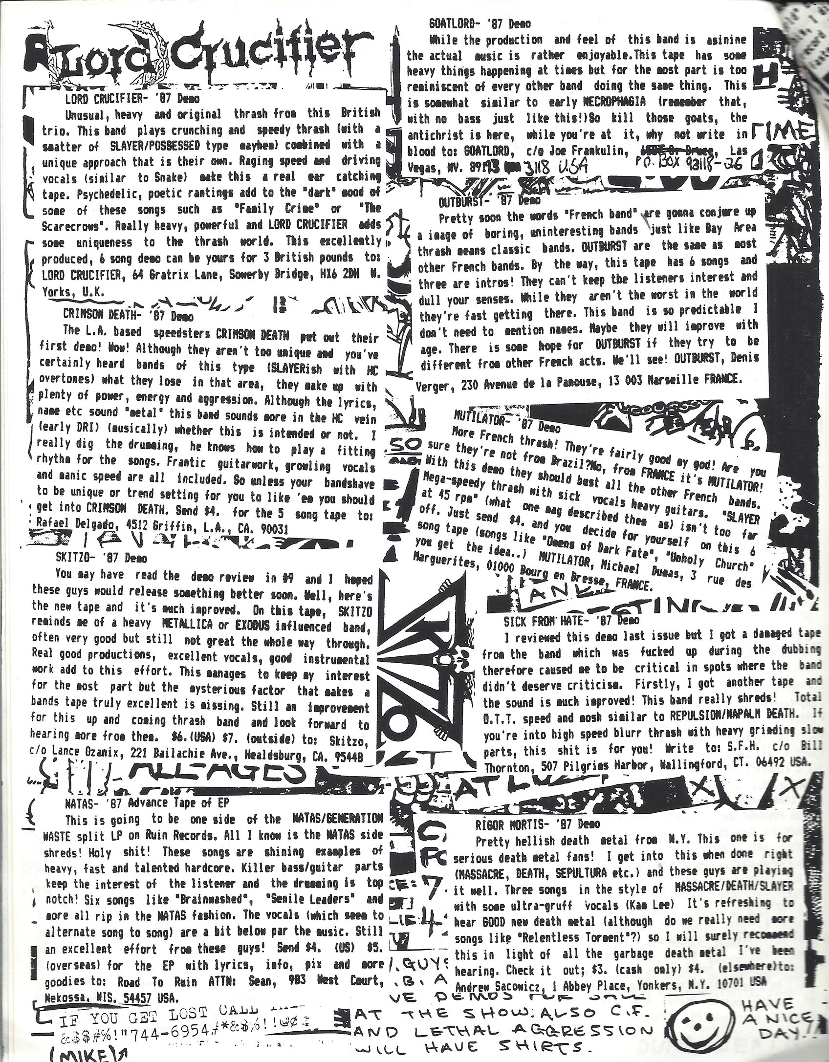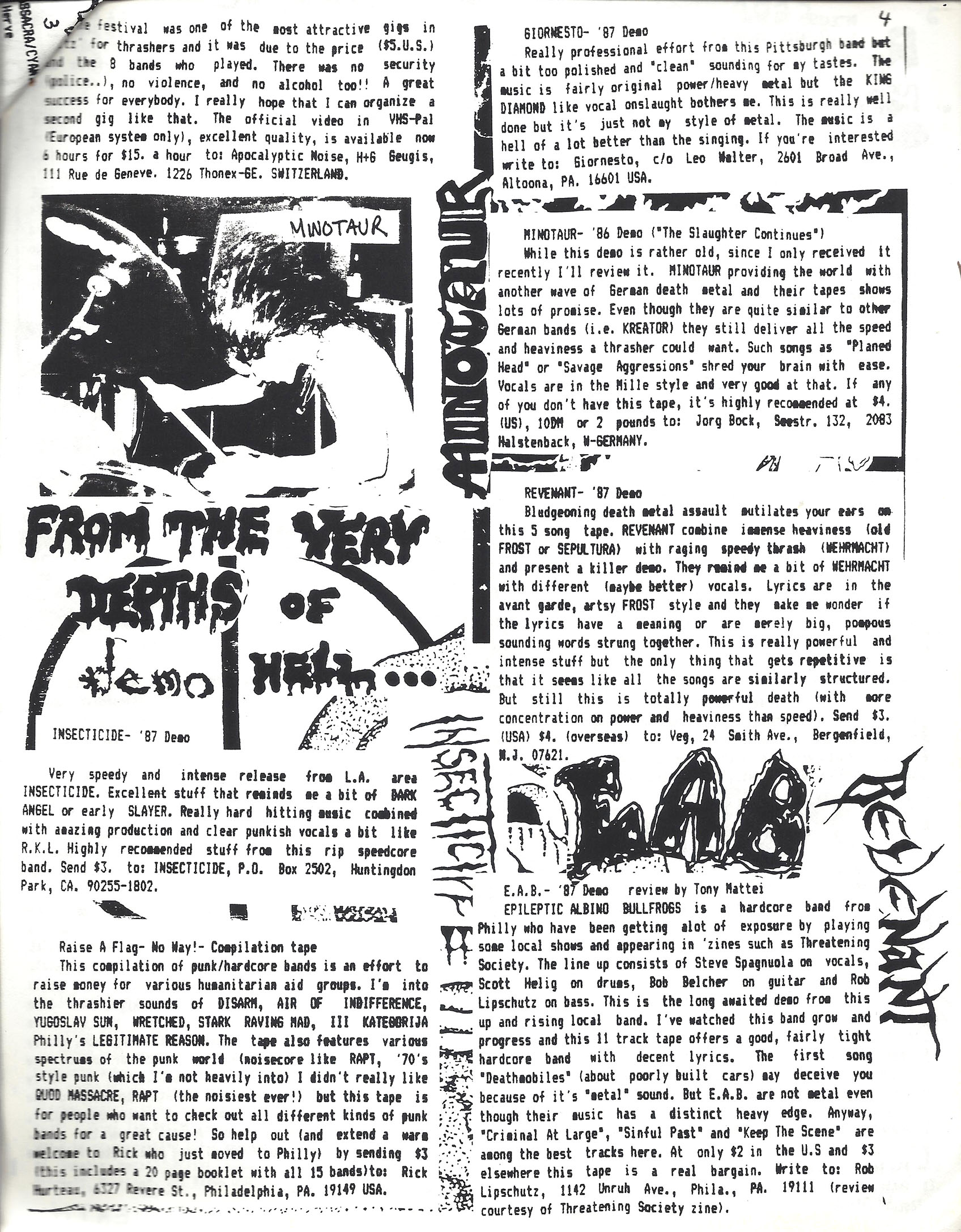 News, live reviews (Cyanide (SWI), Massacra, Mutilator (FRA), Outburst (FRA), Agressor, Artery, Minotaur, Messiah (SWI)), article on PMRC, Irish scene report (Killerwatt, Panic (IRE))..