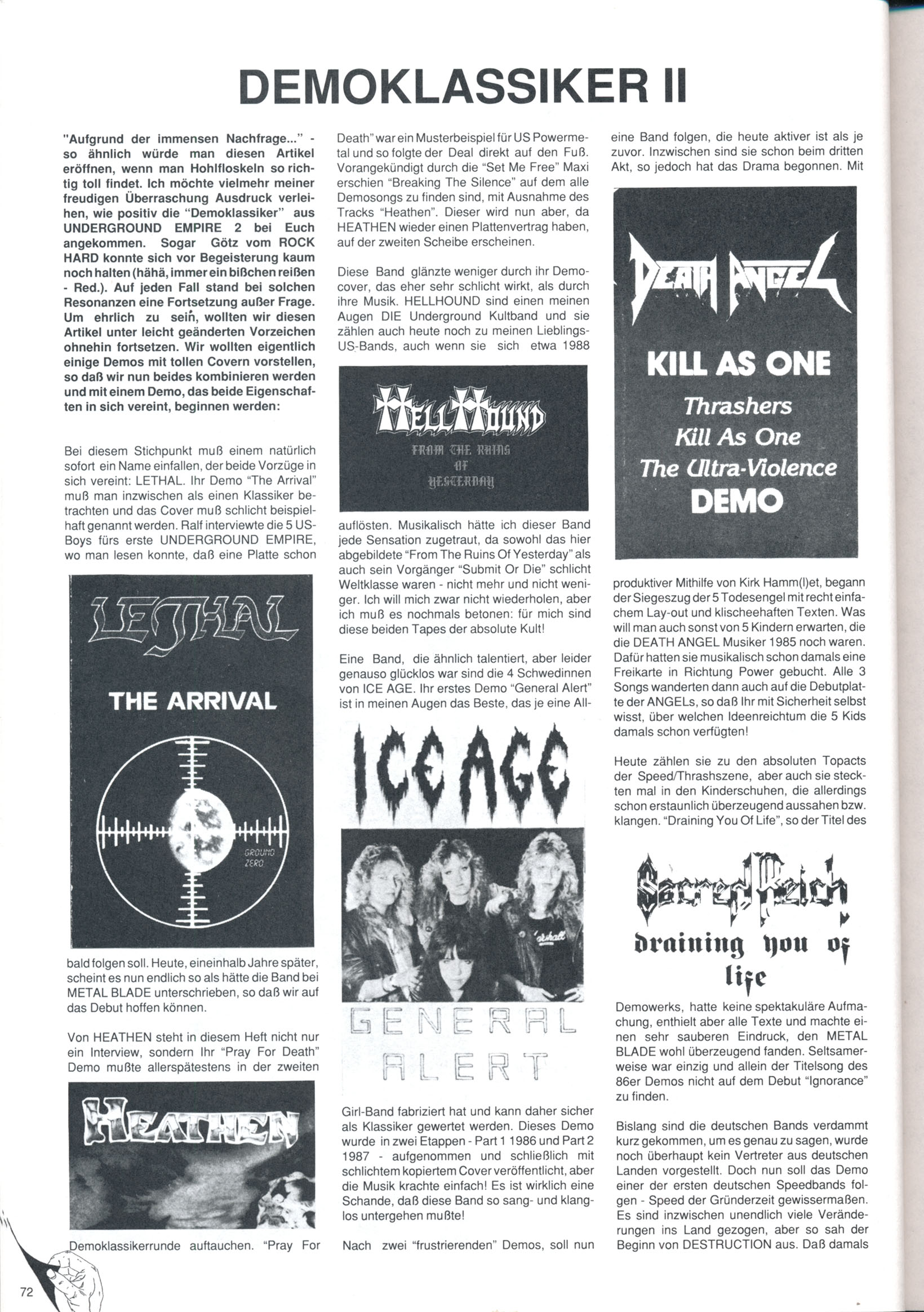 Overdose (GER), Florida Metal scene report (Iced Earth, Incubus, Nocturnus, Brutality, The Guff, Silent Scream, Halifax, Morality, Keith Collins Krunch, Blakkout, Hawaii'an Metal classics (Aloha, Hawaii, Vixen (USA-HI), Cacophony), Crackbuster, Inspector, Bay Area Metal scene report (Wrekking Machine, My Victim, Laughing Dead, Contempt, Bacchus, Kaos), adds, Angelo Branduardi, Bombshells, Adramelch, Dream Theater, Deadly Blessing, Messiah (SWI), Seventh Sign, Drifter, Hittman, Titan Force, Living Death, Blessed Death, Ivanhoe, Sever Warning, Deztroyer, Battlefield, classic Metal demos (see reviews), New York Metal scene report (Coldsteel, Wench, Powersurge, Pfalz Metal scene report (Poison Asp, Penny Lane, Sleazy, Saint Vania, Cat Scratch Fever), Lord Of The Rings fan-fiction..