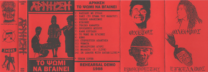 Άρνηση (“refusal”) was a Thessaloniki-based Hardcore/Crust/Grindcore outfit formed in 1987. In addition to a handful of compilation appearances, they released one demo tape entitled “Το Ψωμί Να Βγαίνει” (1988). But what a demo… a veritable whirlwind of irreverent Thrash-Punk, often reaching Grindcore-levels of intensity. Gruff Proto-DM vocals, deliberately careless high-velocity riffs and surprisingly catchy (and well-played) basslines – all set to a rhythmic backdrop shifting between skanks, assertive D-beats and straight-ahead blasting.