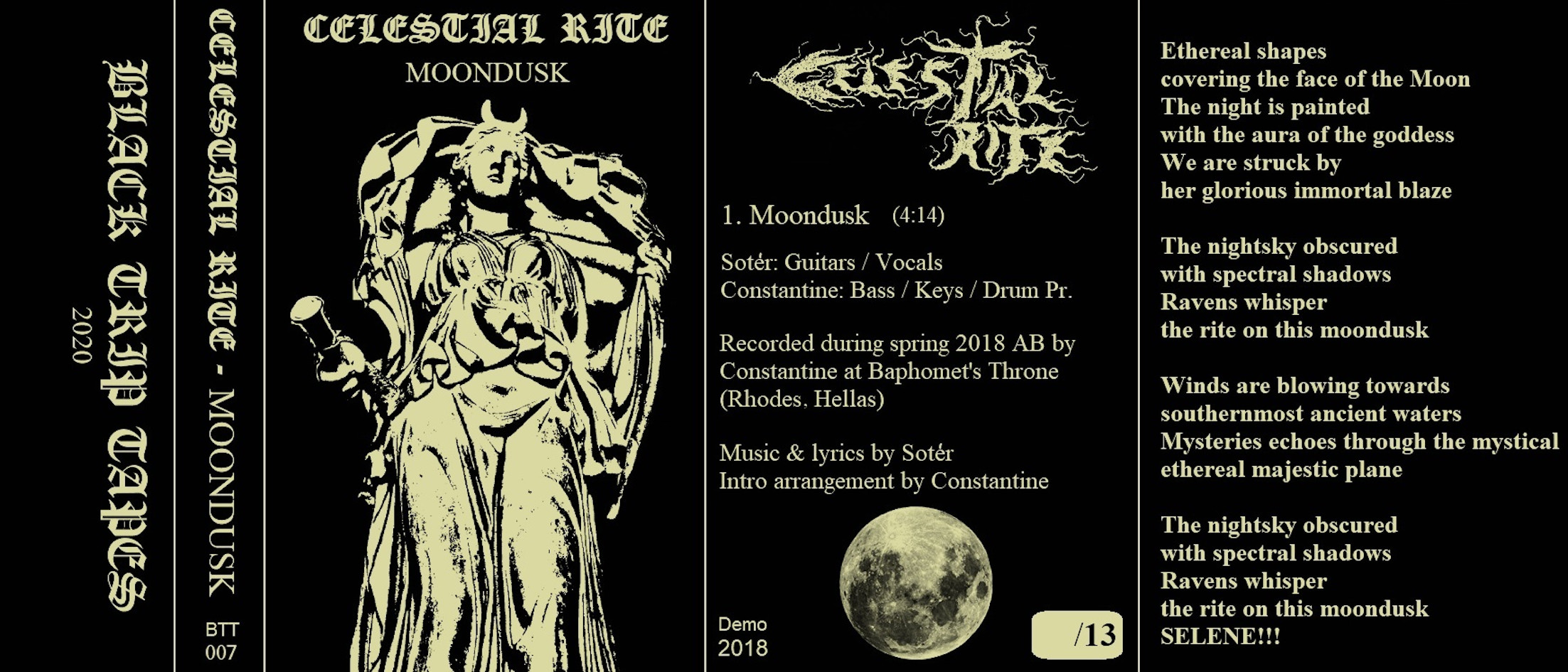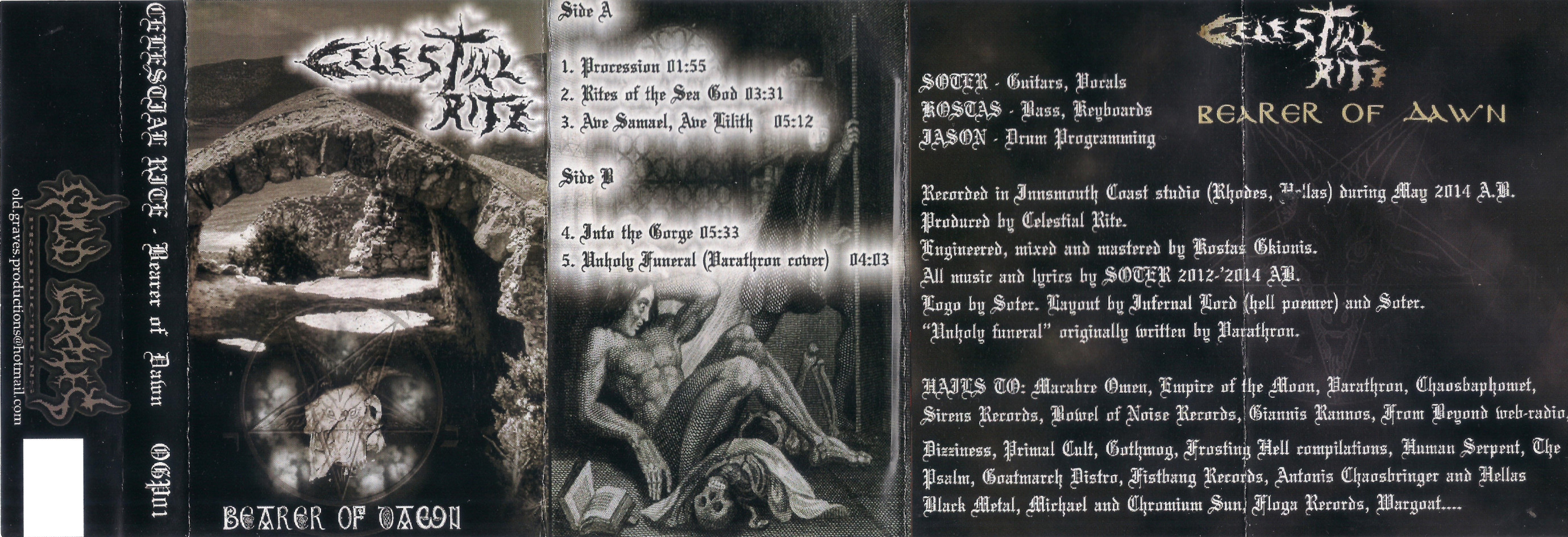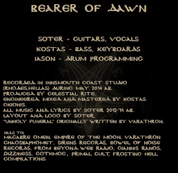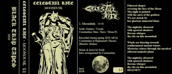 As an introduction to CELESTIAL RITE, it would probably be a good idea to start with either 2014’s “Bearer of Dawn” EP or the more easily accessible (materialistically speaking) “Funeral Rite” (2017), which was released as a split 12” with the Athenian-based FUNERAL STORM on Iron Bonehead Productions. On the other hand, if you want to catch a glimpse at the potential glorious future of Hellenic Black Metal, don’t miss out on CELESTIAL RITE’s more recent output, such as 2018’s one-track demo-CDr “Moondusk” (2018).