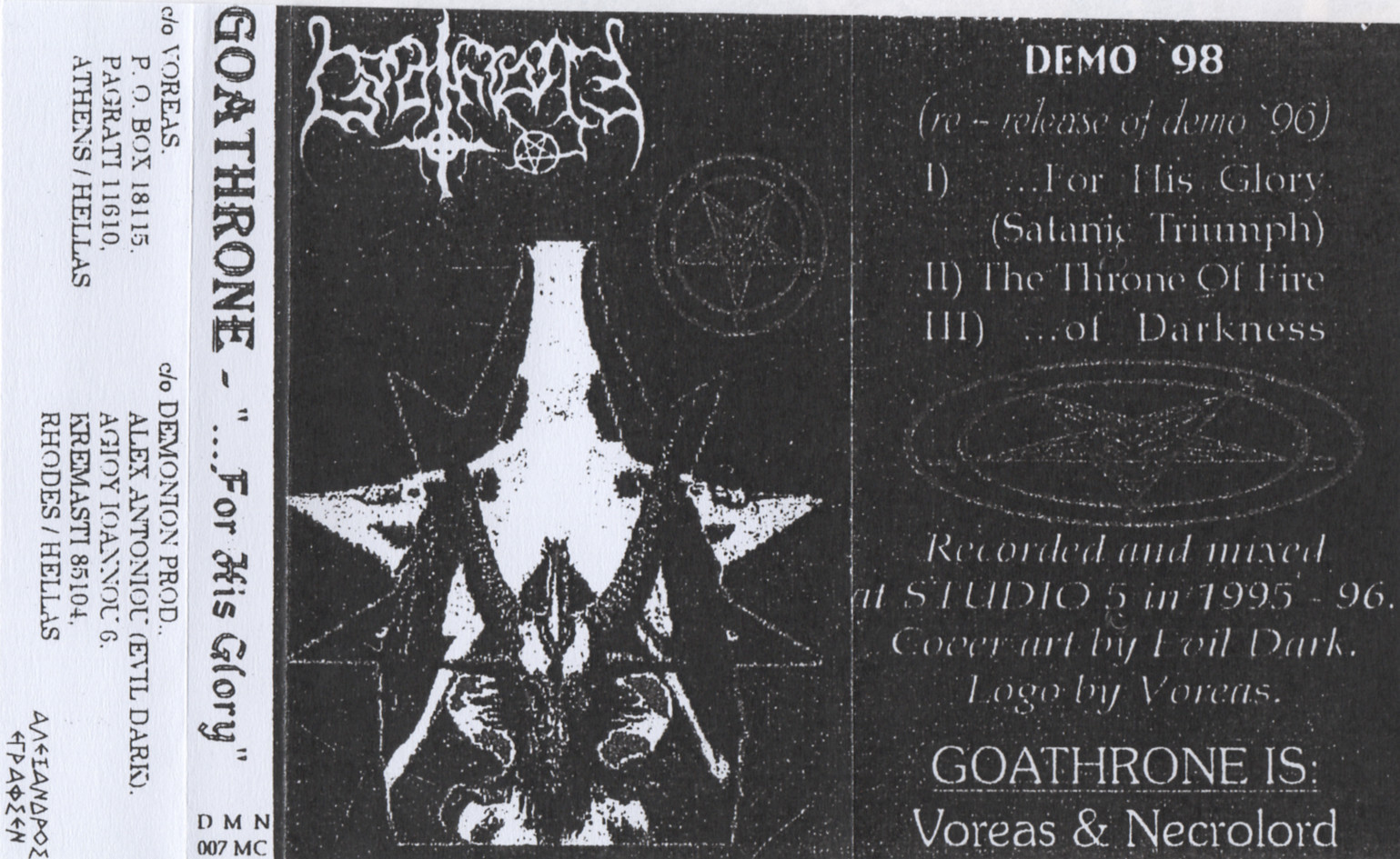 Yet another Athens-based, one-demo Black Metal band featuring multi-instrumentalist Voreas [RIP 2022] (guitars, bass – Βάκχειος, DARK MIGHTY THOUGHT, DRUTENTUS, etc.) – this time teaming up with the equally creative Necrolord (vocals, guitars, keyboards –NAER MATARON, VORPHALACK, WAMPYRINACHT, etc.) The duo’s sole release, entitled “Demo ‘96” – initially released on Voreas’ own Druvid Promotion and subsequently re-released as “…for His Glory” on Demonion Productions – operates in a similar vein to Voreas other endeavors. Perhaps with a somewhat rawer approach, but still with that subtle hint of melody which permeates the works of both DRUTENTUS and Βάκχειος, although with less of a folk vibe compared to the latter two.