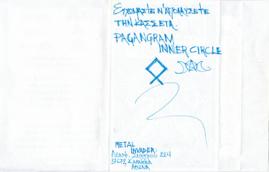 Presumably authored by members of a previously unknown organization referred to as the “Pagangram Inner Circle”, PAGAN CELTIC WISDOM appears sometime in the 1990s or perhaps even the early 2000s. Their only known release was a self-titled tape, containing traditional “Celtic” folk music, which – judging by the authentic character of the songs – actually seems to have been capped from an authentic source rather than composed and performed by P.C.W. themselves. Please correct me if I’m wrong on this account though. Either way, the music has nothing to do with Metal really, but one would have to assume there was some form of connection to the Hellenic Metal scene since the tape – which also includes some hand-written notes in Greek language – was deemed as relevant enough to be sent to the Greek Metal Invader magazine as a promotional item.