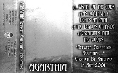 Founded by Saturno (ALASTOR, RAVENBANNER, SATURNO), AGARTHIA released one sole demo recording on Avalon Hellas/Avalon Productions, entitled “Between Eiglophian Mountains…” (2001) before dissolving into obscurity. They also provided, perhaps posthumously, a handful of tracks to various compilation tapes in the 2000s. Stylistically AGARTHIA can be categorized as discordant and noisy, yet epic-inclined underground Black Metal that requires a little bit of patience to be fully appreciated. Not for the faint-hearted!