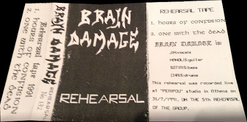 After about six months, BRAIN DAMAGE decided to release their debut proposal – a rehearsal tape recorded live at Peripou Studios (the same studio used by BLIND SIDE on their first demo) in July 1991: two tracks of youthful Thrash/Speed Metal which received fair response from fanzines at the time of release, although some reviewers were not too happy with the vocals.