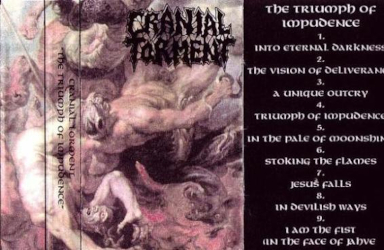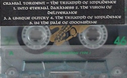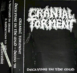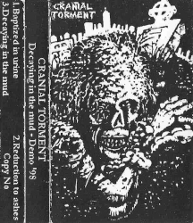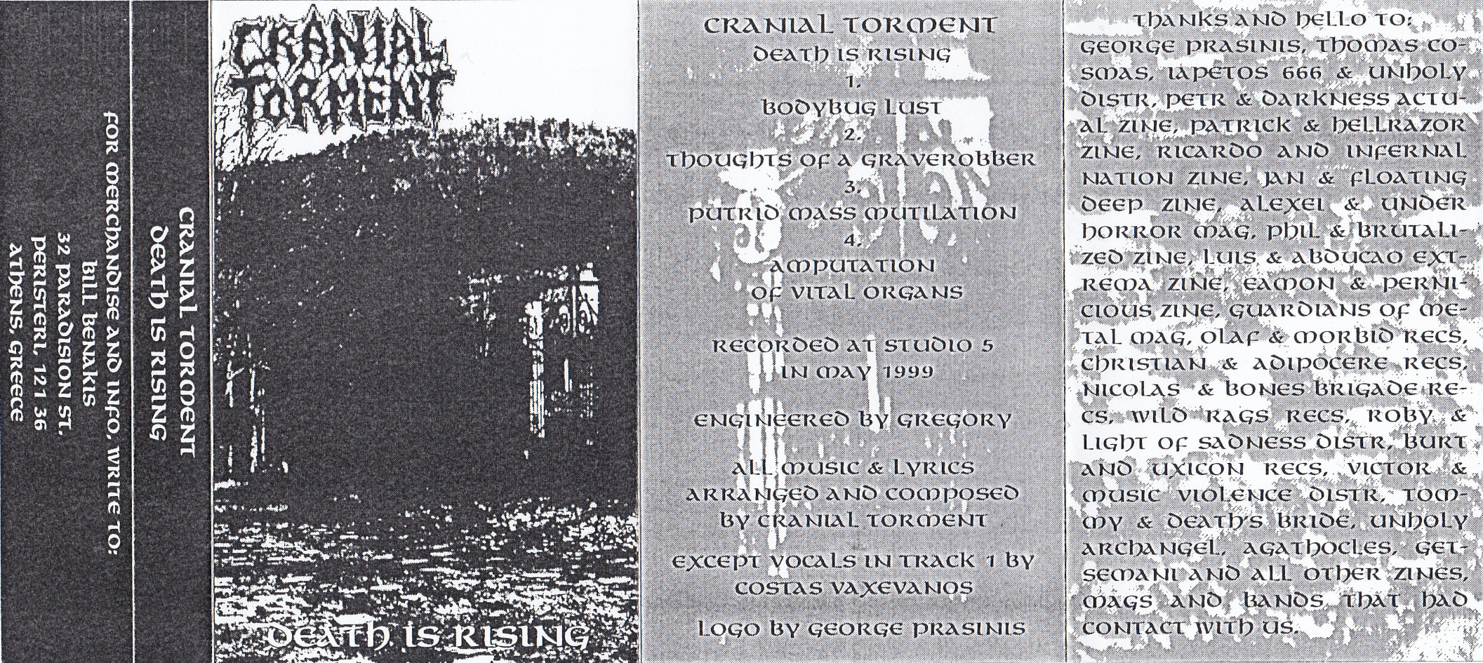 The music remained fairly consistent in terms of both style and quality on CRANIAL TORMENT’s two first demo tapes “Decaying in the Mud” (1998) and “The Triumph of Impudence” (1999), with the biggest change being that Costas left the drum position in 1999; resulting in a shift from flesh-and-blood- to digital percussion. However, the third demo, entitled “Death is Rising” (1999), differs from the others. Here songs has taken a turn towards the primitive, both rhythmically and in terms of melodic contour, while the addition of wandering, almost Heavy Metal-styled guitar solos certainly adds a schizophrenic character to the music.