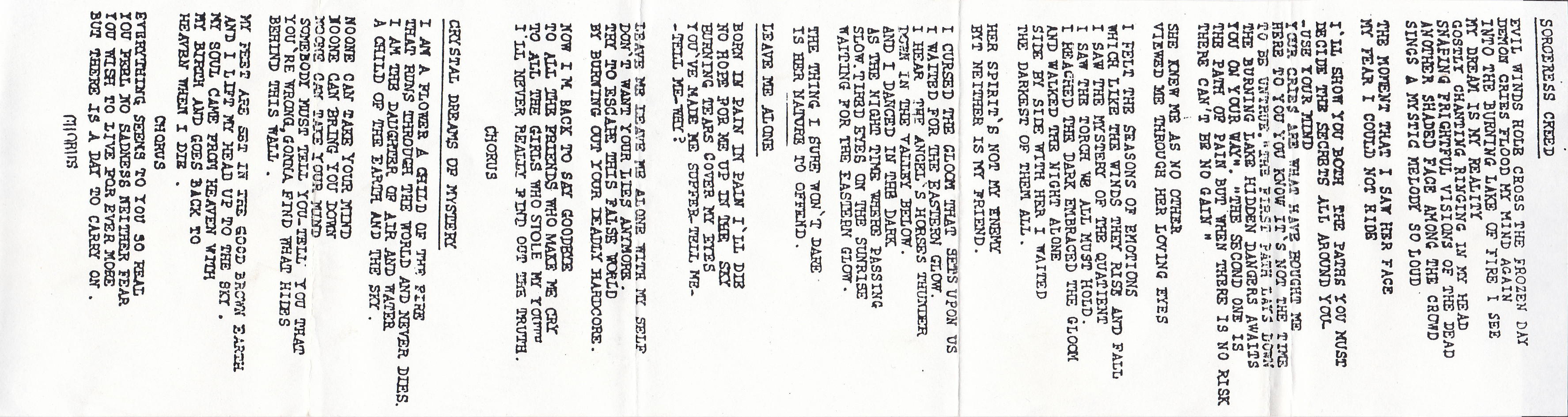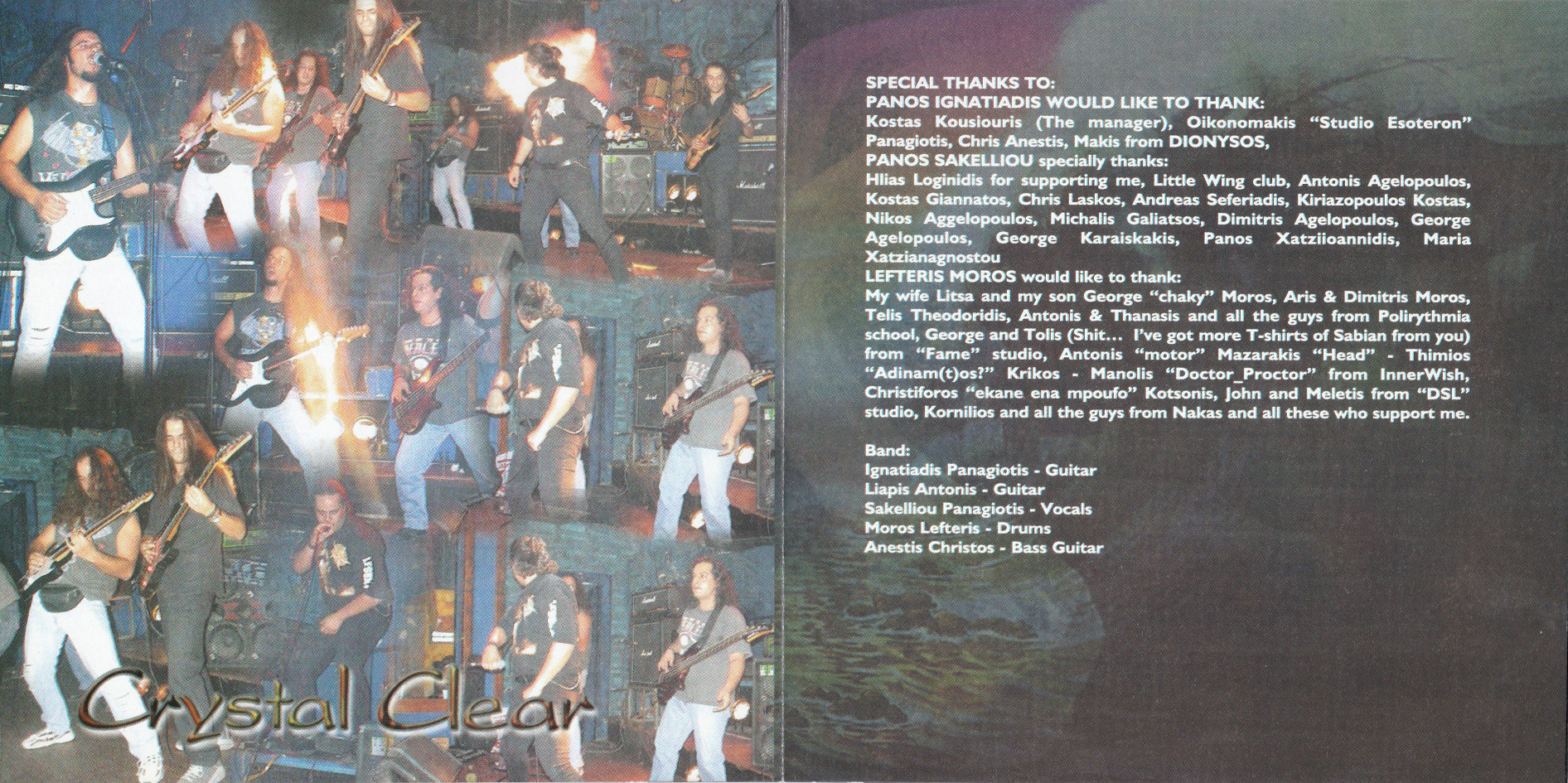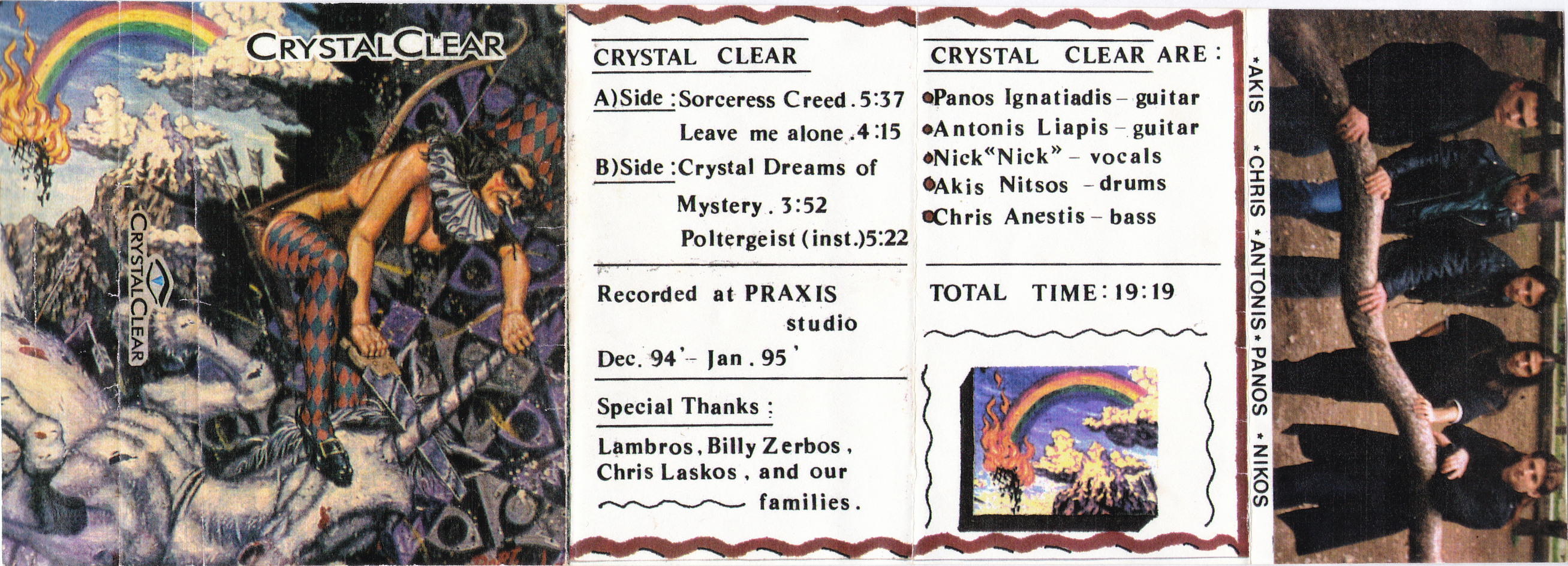 CRYSTAL CLEAR was formed in the early-1990s, playing a blend Heavy- and Power Metal influenced by both domestic forefathers (SPITFIRE, among others) as well as all-time greats like WARLORD, IRON MAIDEN and MERCYFUL FATE/KING DIAMOND. Their first release – a self-titled demo tape – came out in 1995 and featured eye-striking, slightly unsettling artwork that fit quite well with the music held within. The lineup at the time of recording included Nikos Outsikas (vocals – BLACK VOYAGE, BLOODLUST, OUTCAST), Antonis Liapis (guitars), Panagiotis Ignatiadis (guitars), Chris Anestis (bass) and Akis Nitsos (drums). “Crystal Clear” (1995) received positive response from the Greek underground press, but CRYSTAL CLEAR soon faced the standard fate of upcoming Greek metal bands: obligatory army service.