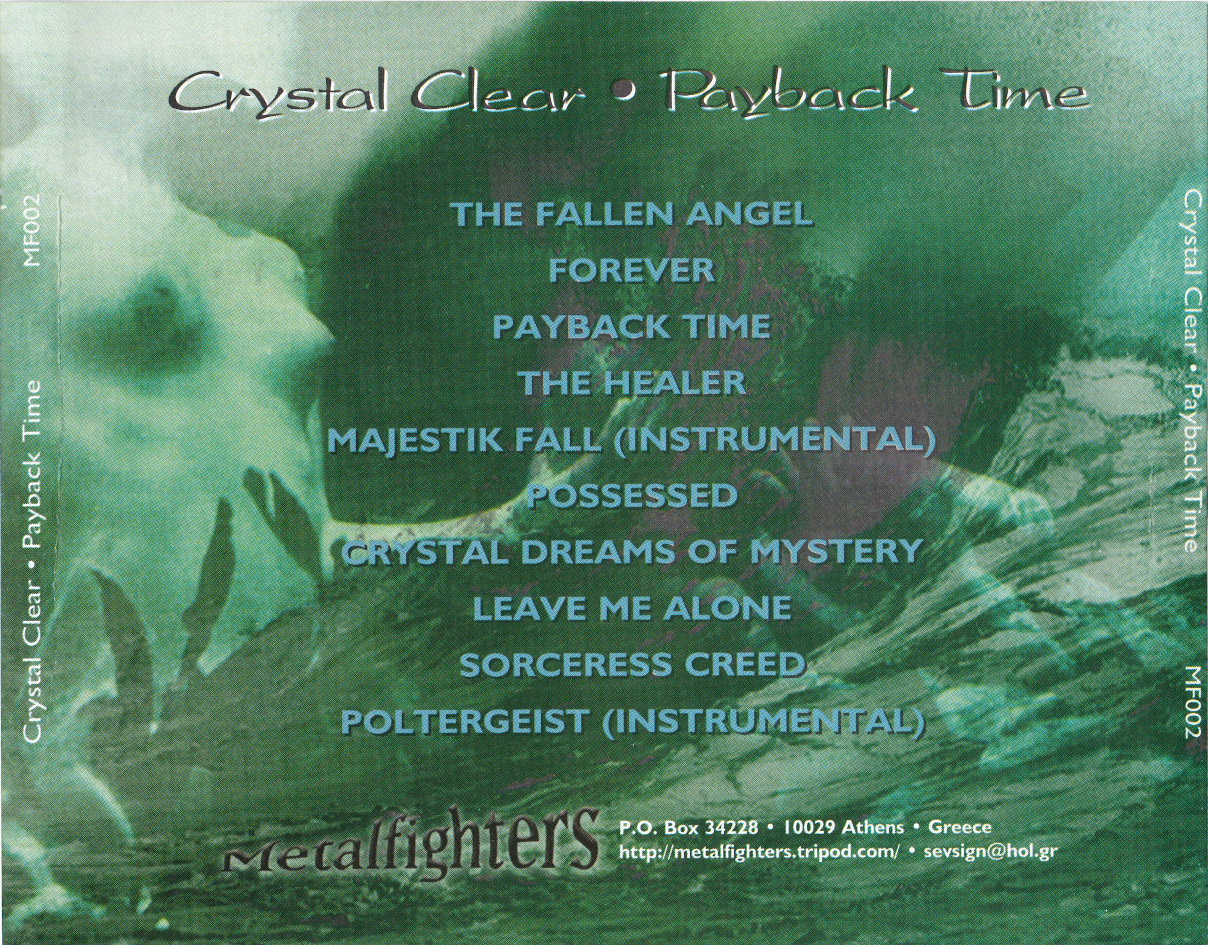 Fortunately, after being put on ice for a couple of years CRYSTAL CLEAR was resurrected in 1997 by guitarists and founding members Antonis Liapis and Panagiotis Ignatiadis along with former bassist Chris Anestis. The remaining positions was injected with fresh blood in the form of front man Panagiotis Sakelliou (vocals – BLIND JUSTICE) and drummer Terry Moros (drums, INNERWISH). In 2003 CRYSTAL CLEAR released their debut full-length album, called “Payback Time”. Well, whether it’s an actual album or an EP is debatable, as about 40% of the CD’s playing time consists of the previously released self-titled demo tape (something that most music journalists seem to have missed out on back in the day). Either way, and despite obvious contrasts in production and performance, the six newly composed songs blend nicely with the old material and doesn’t really cause any complications as far as the listening experience goes. What’s striking though is the flowering of the band’s abilities as composers in epic songs like “The Healer” or “Possessed”, where the band takes their Heavy/Power metal in a decidedly dark direction in the vein of early KING DIAMOND or underground power-prog acts like ZION’S ABYSS.