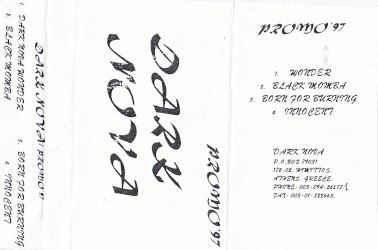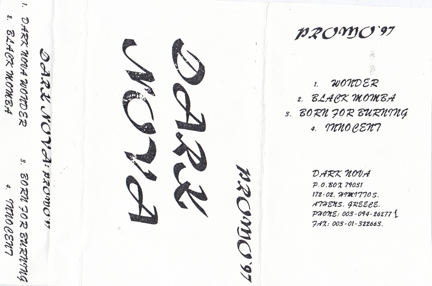 In 1997, DARK NOVA began the distribution of a promotional tape, simply entitled “Promo ‘97” (1997). We don’t have the lineup for “Promo ‘97”, but it seems highly likely that the core trio of Johnny K. (vocals), Ilias Koskouris (guitars) and Nick Adams (drums) partook in the recordings. Judging by the new material, the band was arriving at a slightly modified style compared to previous outings. The music still moved within the Heavy/Power Metal field, but has taken a more technical and muscular direction –less quirky than the early stuff, but still solid. One surprise was the inclusion of a cover of BATHORY’s “Born for Burning”, tastefully modelled into the DARK NOVA template. This track was also included on Metal Invader’s BATHORY tribute CD issued in 1997.