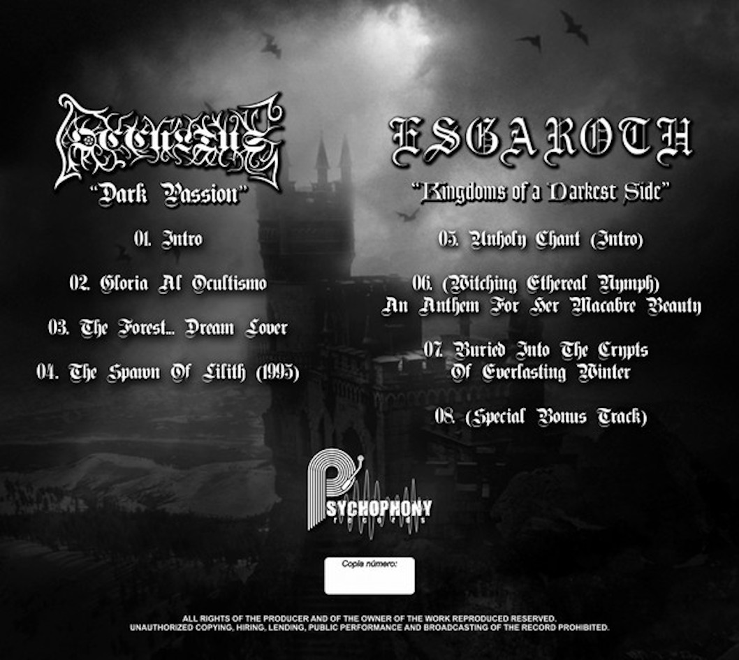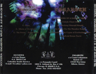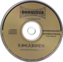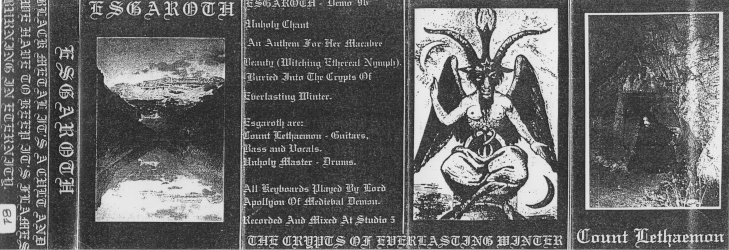 By the time of the demo debut, ESGAROTH consisted of the duo Spyros “Count Lethaemon” Tzouvalis (vocals, guitars, bass – BEHELAL, MEDIEVAL DEMON, THE BLOODCULT, etc.) and Unholy Master (drums), along with Kostas “Lord Apollyon” Karras of MEDIEVAL DEMON on session keyboards. Stylistically, “Crypts of Everlasting Winter” (1996) bears more semblance to Northern European Black Metal than its Hellenic counterpart. Lo-fi, raw and monochromatic, but with a certain epic sensibility somewhat similar to the contemporary works of Germany’s MOONBLOOD. Someone must’ve taken heed of this release, as the demo was later rereleased as a split-CD with Colombia’s OCCULTUS under the title “Dark Passion/Kingdoms of a Darkest Side” (1998) on Sempiternal Productions and then in turn re-re-released by the Columbian label Psychophony Records in 2018.
