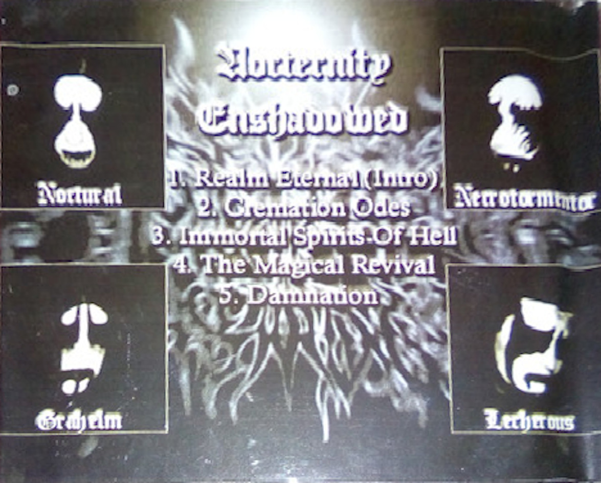 Interestingly, the third and last demo under the name of NOCTERNITY ENSHADOWED once again witnessed a band eager to explore new musical territories. With Necrotormentor (guitars) and Grahelm (drums) now joined by newcomers Drakhon (vocals) and Draenzarth (bass), 2001’s self-titled, three-track demo CDr largely eschews the grand and melodic/atmospheric approach of “Cremation Odes” in favor of a significantly more violent and semi-chaotic sound, closer to the hyper-sped works of say, Sweden’s MARDUK – although N.E.’s music comes across as significantly more thorough-composed than a release like “Panzer Division Marduk” (1999). This exploratory approach to style would seemingly remain with the band for the rest of their career, as can be witnessed on subsequent works released under the shortened name of ENSHADOWED.