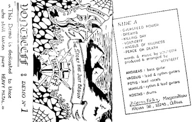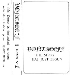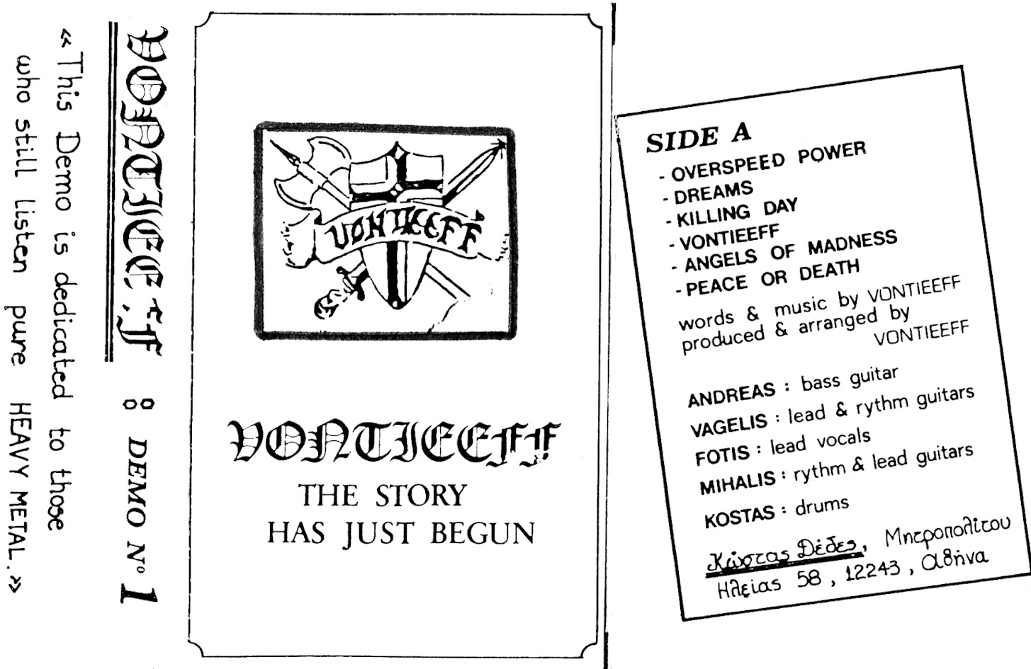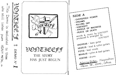 Formed in 1988, VONTIEEFF was a Heavy Metal band from Aigaleo (Athens), consisting of Fotis (vocals), Michalis (guitars), Vangelis (guitars), Andreas (bass) and Kostas (drums) – sorry, no surnames available at current. Their sole demo tape, a six-tracker named “The Story Has Just Begun” (1989), comes highly recommended for its energetic NWOBHM/Euro Metal style that carries enough grit to hit just the right spot. At least three different cover variations exists of the tape, as can be seen below in the discography section.
