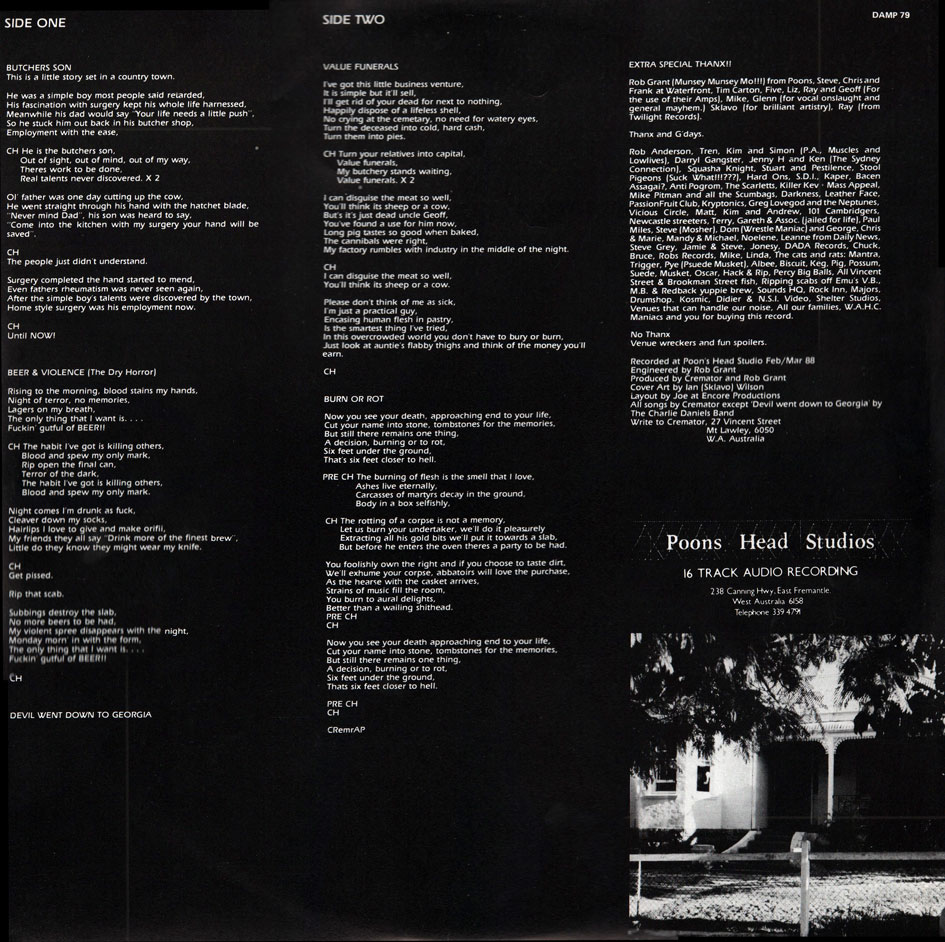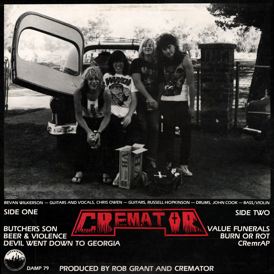 Rough and ready do it yourself primitive street thrash from Perth Australia. Humorous lyrics and song titles with raw youthful charm - Beer & Violence!! A low budget affair so it doesn't have bay area EXODUS / TESTAMENT style mega production with all the precision and chunk - nope this one is raw, fast and not always 100% tight but a fun listen nonetheless. The Charlie Daniels cover is very interesting, fusing heavy metal thrash with frenetic violin. Cremator were doing it in Perth Australia long before many others and this highly sought after mini LP is an ultra rare piece of Australian thrash metal history. Interesting Trivia: Drummer Russell Hopkinson mothballed his metallic double kicks & became a member of Aussie indie pop act YOU AM I.
