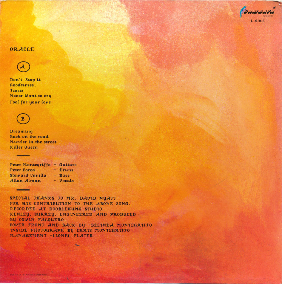 Dont be fooled by the psychedelic (a la GONG) but excellent cover because ORACLE play very fine melodic metal and their album is a highly sought after rarity of Spanish metal. Some tracks can be considered more hard rock than metal, for example Goodtimes, but that goes only for the first side as the second one is a small masterpiece in my humble opinion. To my ears ORACLE sound like the more melodic bands of N.W.o.B.H.M., somewhere between GRIM REAPER (Rock you to hell), MAGNUM (On a storytellers night), TOKYO BLADE (No remorse), PERSIAN RISK and stuff like that. They might also slightly remind to some of you of STRANA OFFICINA especially on their last album. No Spanish lyrics, a very good vocalist and excellent dreamy sometimes-guitars are more than enough to make you chase this album. As I said B-side is almost excellent and if I had to choose one song to be the leader that would be Murder in the streets- its the heaviest of them all and has a very memorable chorus as well. So, dont waste your time searching for well known (but pretty average IMO) bands like OBUS, BARON ROJO etc. and try at least to hear ORACLE. I bet you wont regret it.